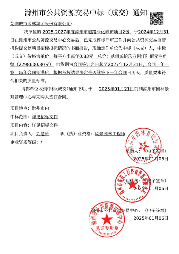 歲序更替,華章又新,園林集團(tuán)中標(biāo)喜訊傳來(lái),成功斬獲2025-2027年度滁州市道路綠化養(yǎng)護(hù)項(xiàng)目2包,實(shí)現(xiàn)開門紅,獻(xiàn)上新春賀禮。此次中標(biāo),是園林集團(tuán)在滁州市綠化市場(chǎng)的首次亮相,也是公司在蕪湖市外業(yè)務(wù)拓展的重大突破。