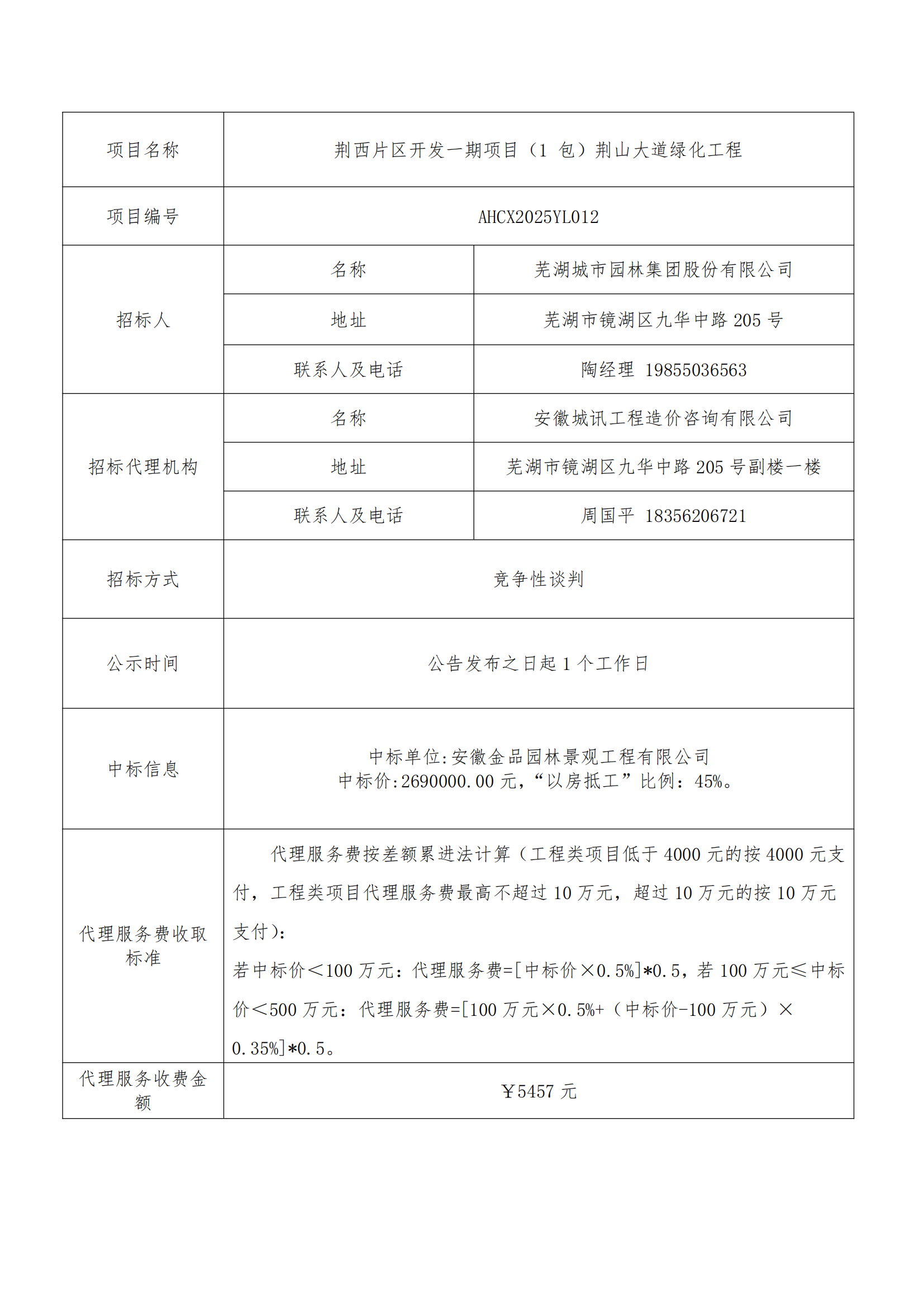 荊西片區(qū)開發(fā)一期項(xiàng)目(1 包)荊山大道綠化工程中標(biāo)結(jié)果公示