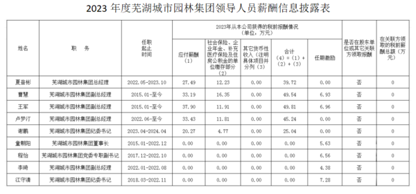 2023年度蕪湖城市園林集團領導人員薪酬信息披露表