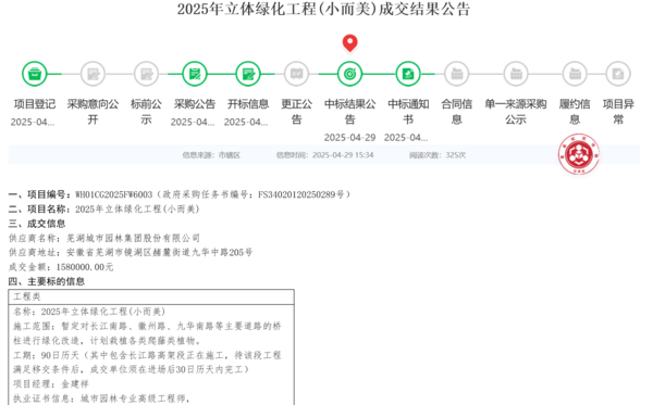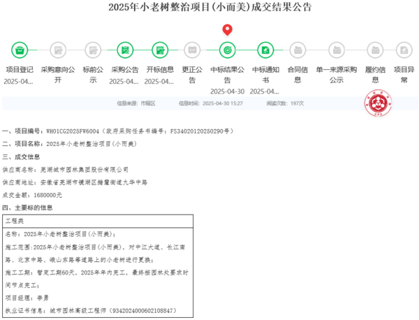 2025年小老樹整治項(xiàng)目(小而美),中標(biāo)價(jià)1680000元,工作內(nèi)容是對(duì)中江大道、長(zhǎng)江南路、北京中路、峨山東路等道路上的小老樹進(jìn)行更換,計(jì)劃工期60日歷天。