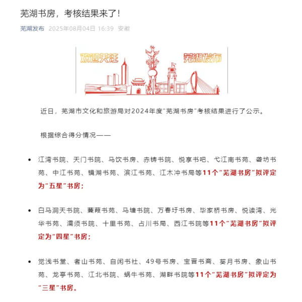權威發(fā)布!根據 “蕪湖發(fā)布”官方公示(2025年8月4日) 及 《2024年度“蕪湖書房”考核結果公示》鏡湖書苑在蕪湖市文化和旅游局的嚴格考核中表現卓越,成功躋身 “五星書房” 行列!
