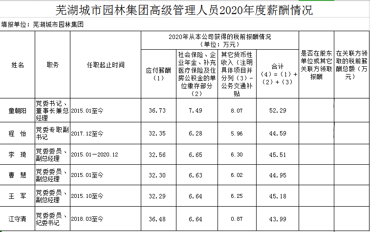 2020年度蕪湖城市園林集團企業(yè)負(fù)責(zé)人薪酬披露