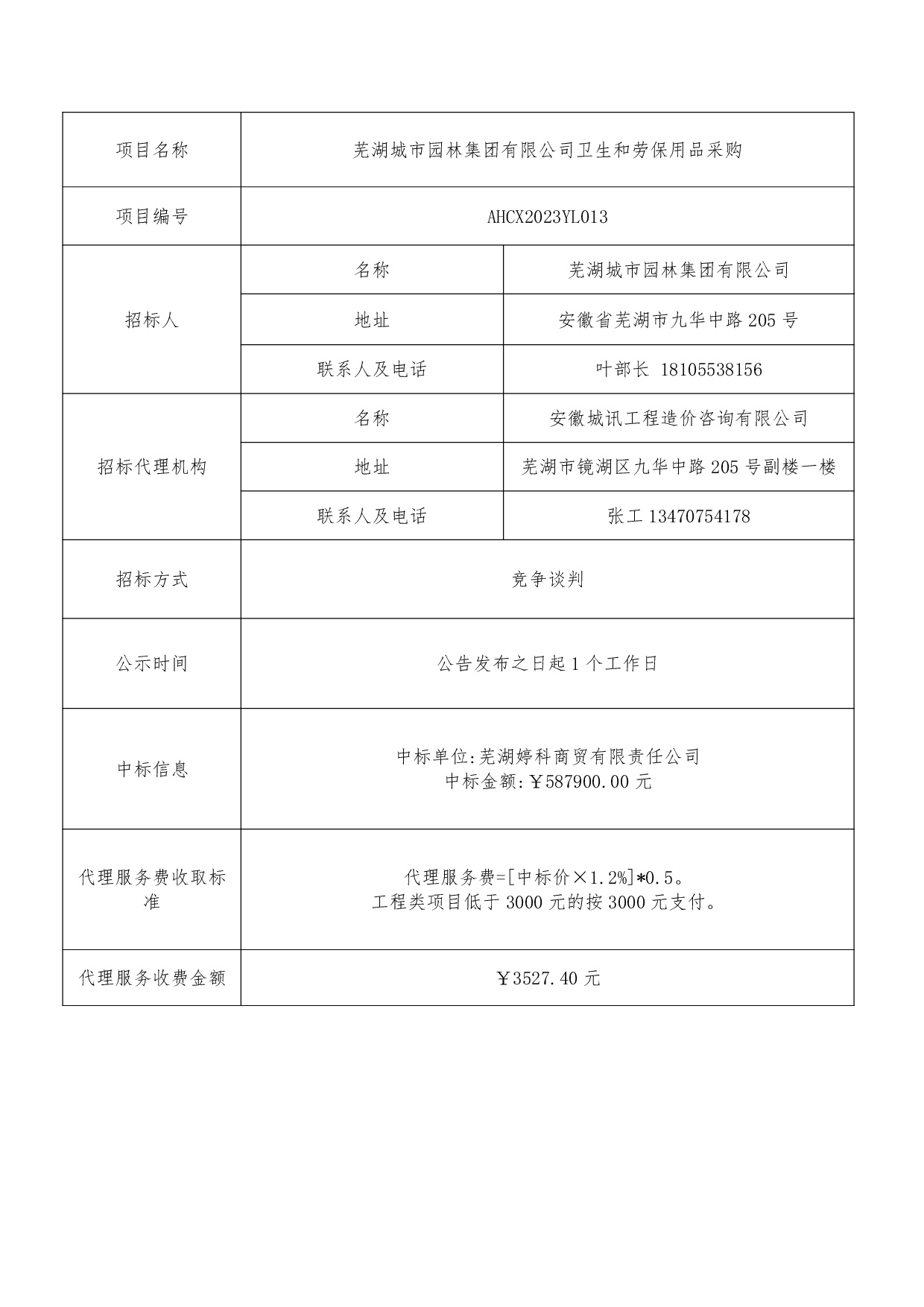 蕪湖城市園林集團(tuán)有限公司衛(wèi)生和勞保用品采購中標(biāo)結(jié)果公示