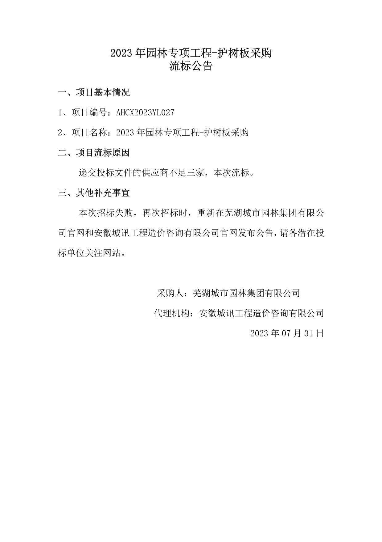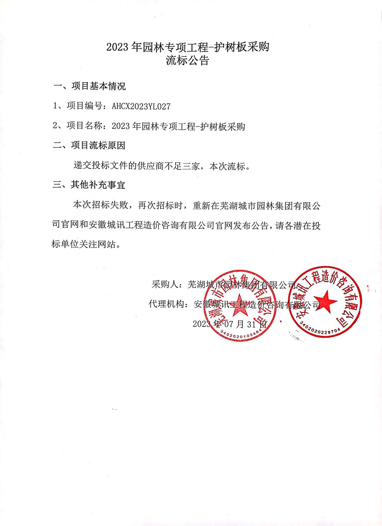 2023年園林專項(xiàng)工程-護(hù)樹板采購流標(biāo)公告