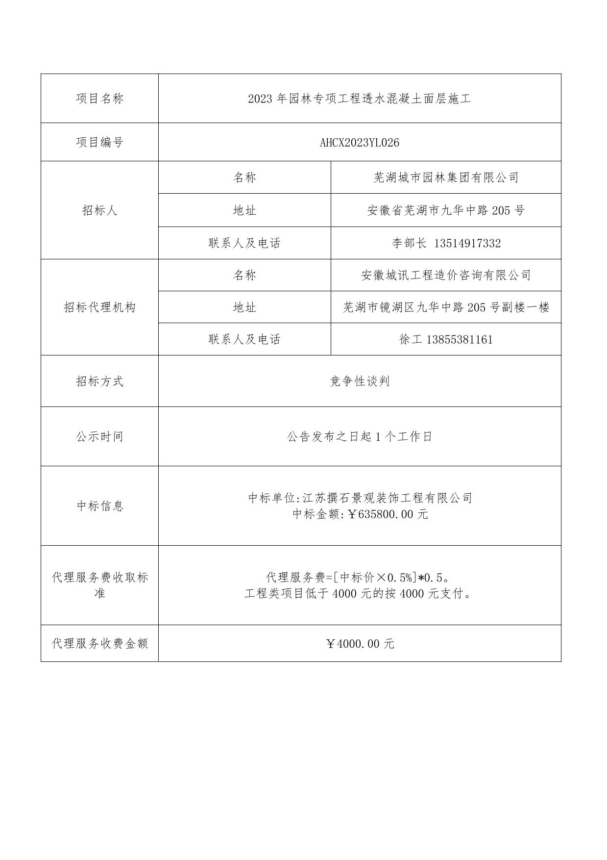 2023年園林專項(xiàng)工程透水混凝土面層施工中標(biāo)結(jié)果公示