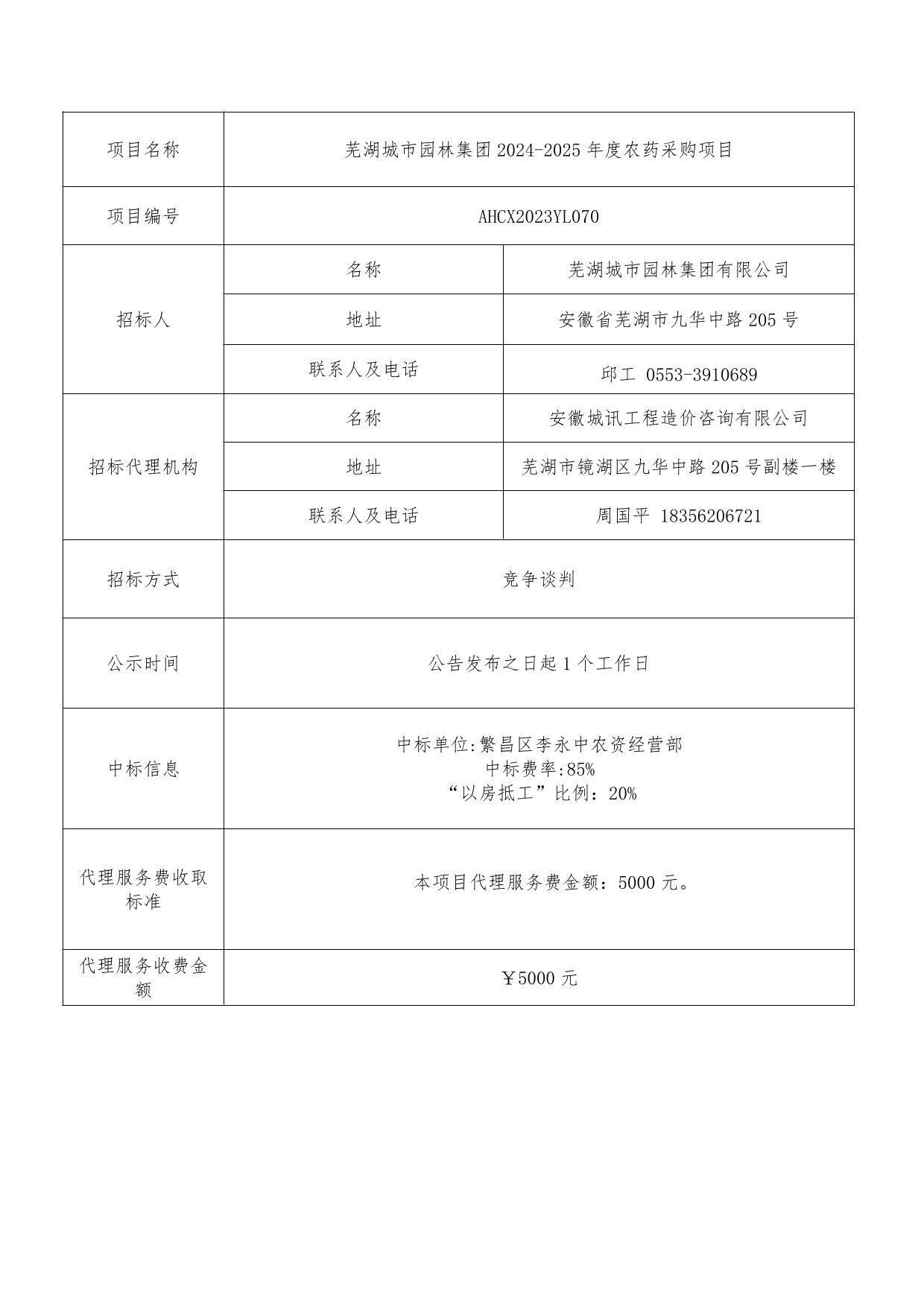 蕪湖城市園林集團2024-2025年度農(nóng)藥采購項目成交結(jié)果公示