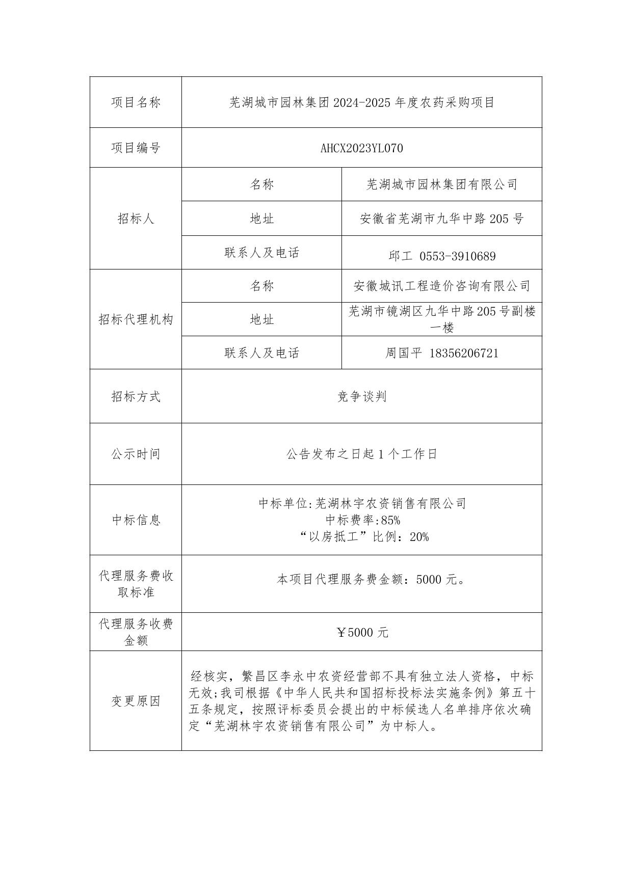 蕪湖城市園林集團(tuán)2024-2025年度農(nóng)藥采購項(xiàng)目成交結(jié)果變更公告