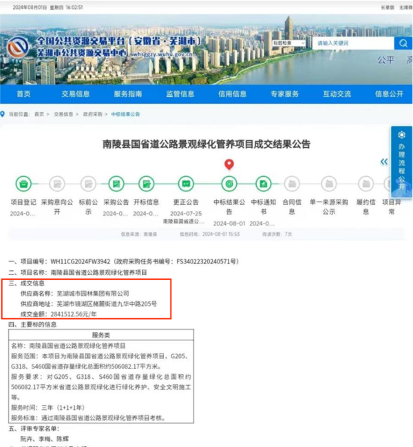 2024年8月1日,蕪湖城市園林集團(tuán)有限公司憑借豐富的綠化養(yǎng)護(hù)管理經(jīng)驗(yàn)、雄厚的施工技術(shù)力量和良好的行業(yè)信譽(yù),在眾多競爭者中脫穎而出,以2841512.56元/年的價(jià)格成功中標(biāo)南陵縣國省道公路景觀綠化管養(yǎng)項(xiàng)目。